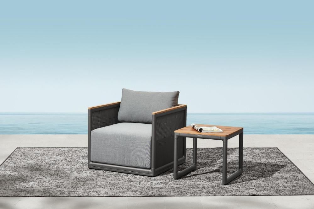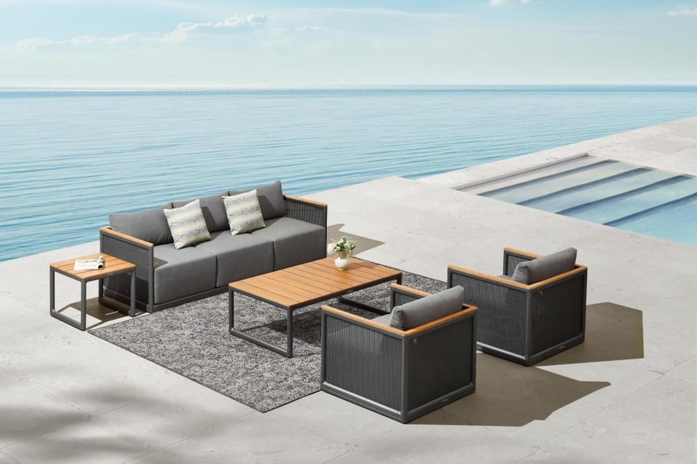 - السطح الخشبي لطاولة القهوة يضيف دفئاً بصرياً ويكمل جمالية طقم اريكه للحديقة