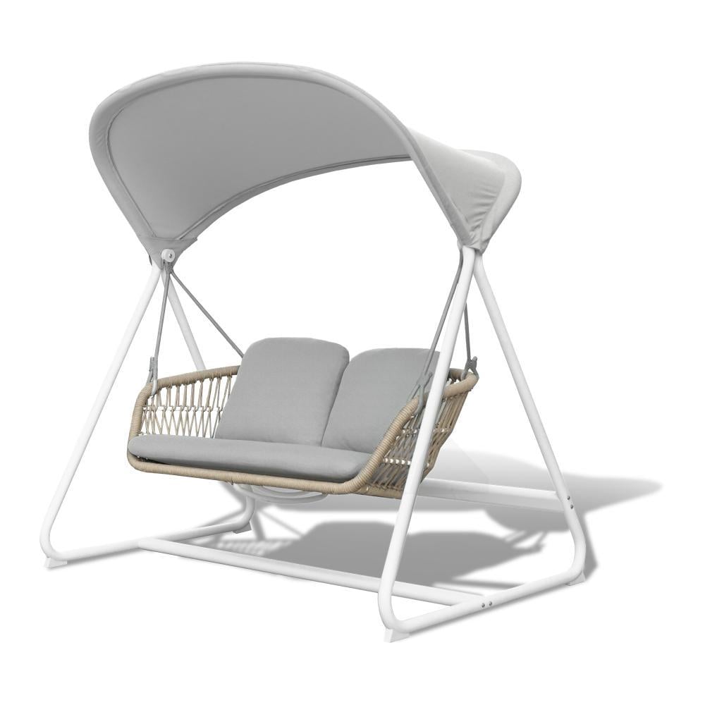 - التصميم الانسيابي لـ كرسي متأرجح يخلق تناغماً بصرياً مع الحدائق أو الشرفات من خلال الحبال الفاتحة والهيكل الأبيض.