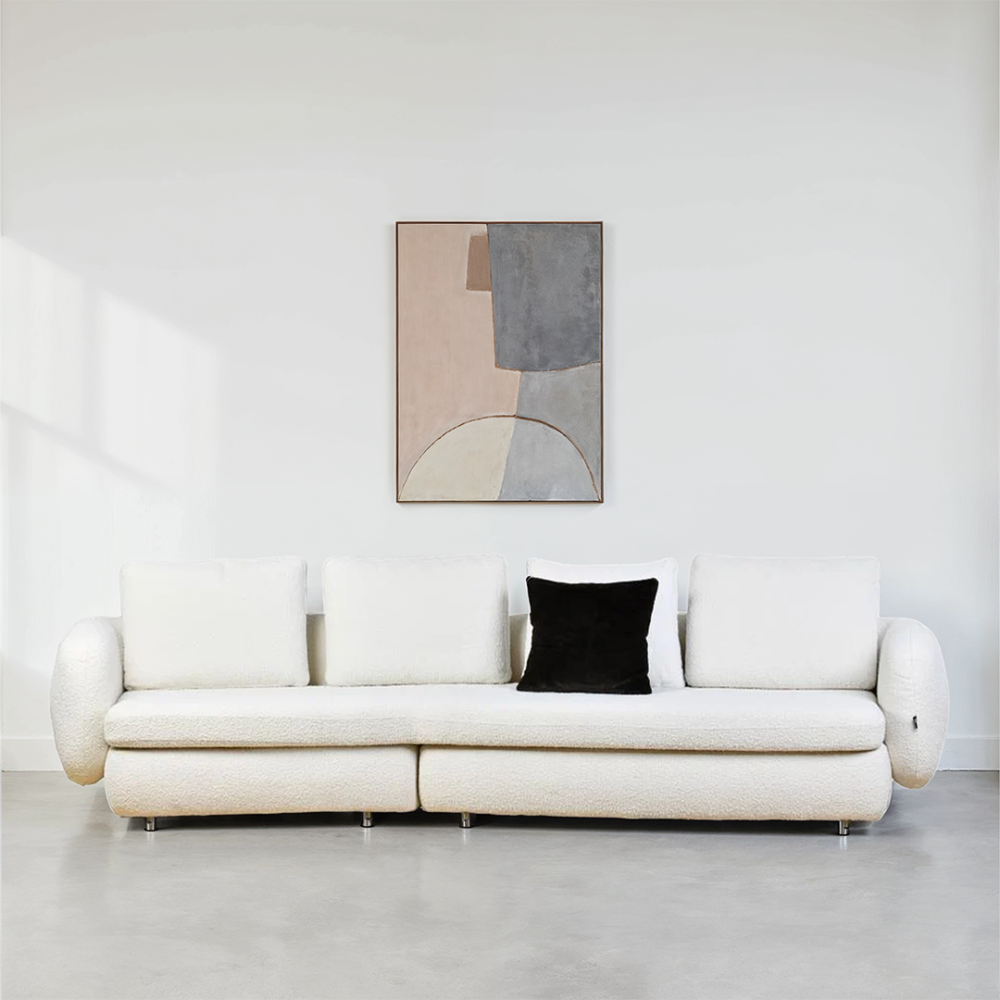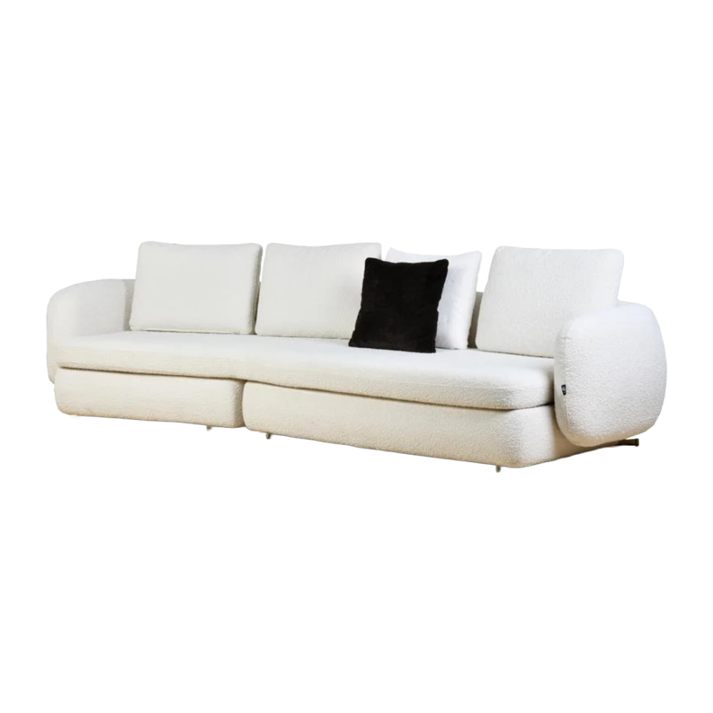 • تجمع الكنبة بين القماش الفاخر واللون الأوف وايت لتقدم حضوراً بصرياً هادئاً ومتناسقاً مع مختلف الديكورات.
