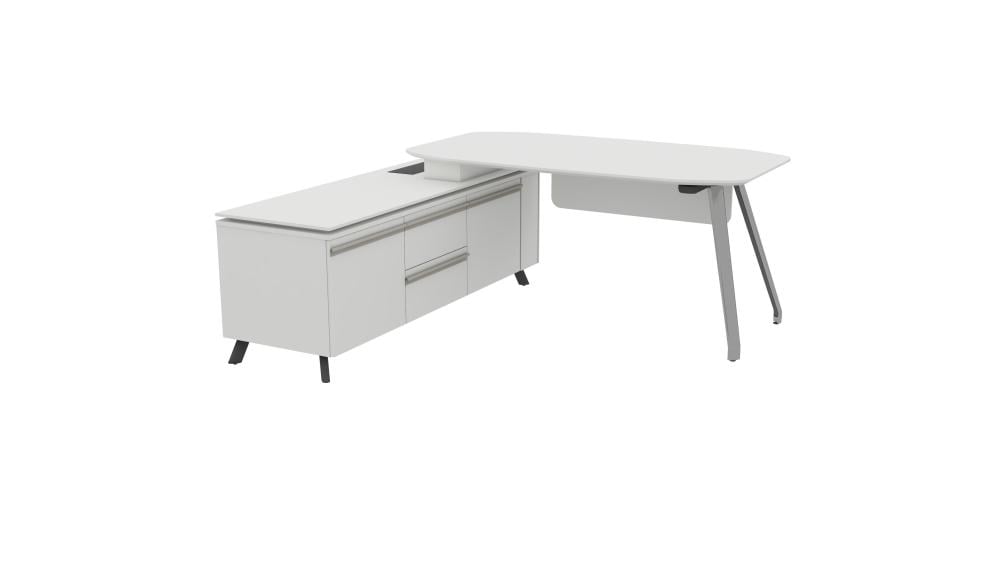 - نوع التصميم: طاولة على شكل حرف L مع خزانة جانبية مثبتة.