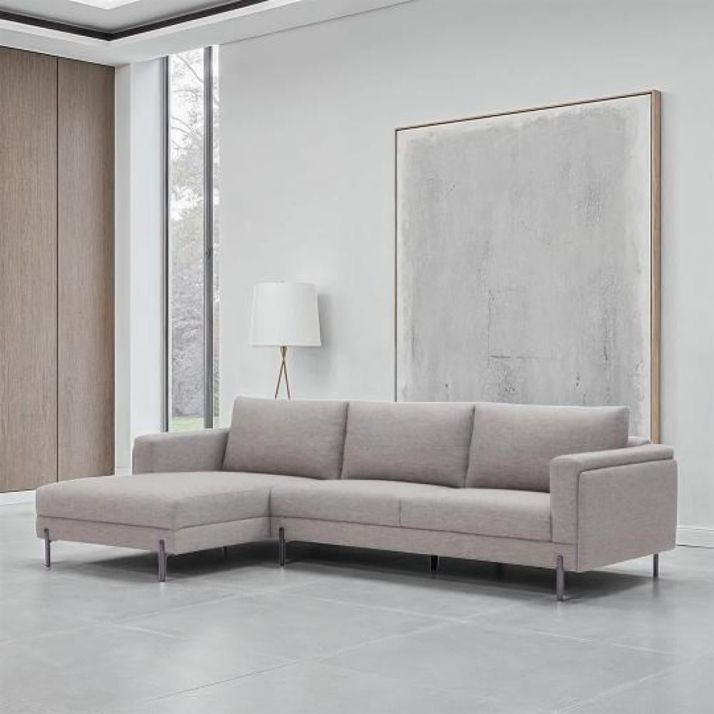 L shape sofa set with a large seat is ideal for relaxation and is the perfect addition to your home decor collection of modern furniture, thanks to its simple design and fabric color shade that will help you coordinate it with many surrounding internal decoration. This small sofa set is suitable for sitting, watching TV, or simply lounging and relaxing behind a coffee table. It features sturdy bases made from durable titanium metal, ensuring quality and longevity. It fits well in various spaces, from medium to small, with dimensions of 283×164×80 cm.