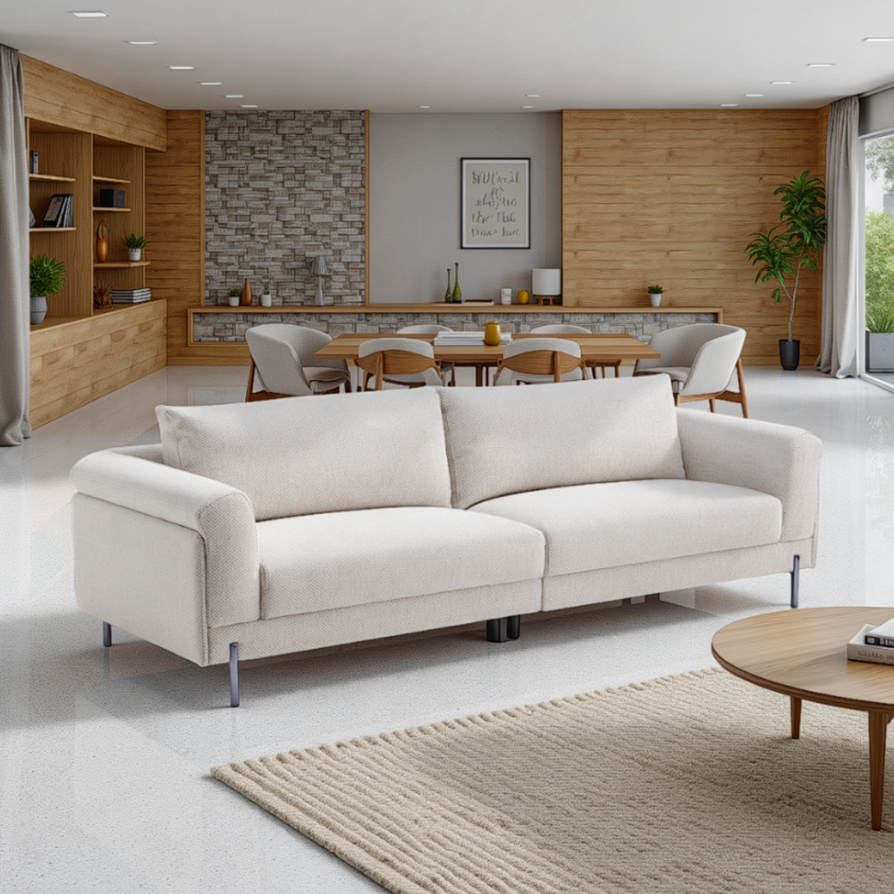 Introducing our Ultra-Comfort 3 Seater Sofa - the epitome of elegant comfort. This refined piece of furniture, upholstered in a soothing light beige fabric, is coupled with sturdy titanium legs for unparalleled durability, creating a sublime union of style and function. The ample seating space ensures cozy lounging for you and your loved ones, offering a perfect balance of comfort and utility. Its soothing color blends effortlessly with most decor styles, making it an ideal choice for those in pursuit of a stylish and comfortable seating solution.