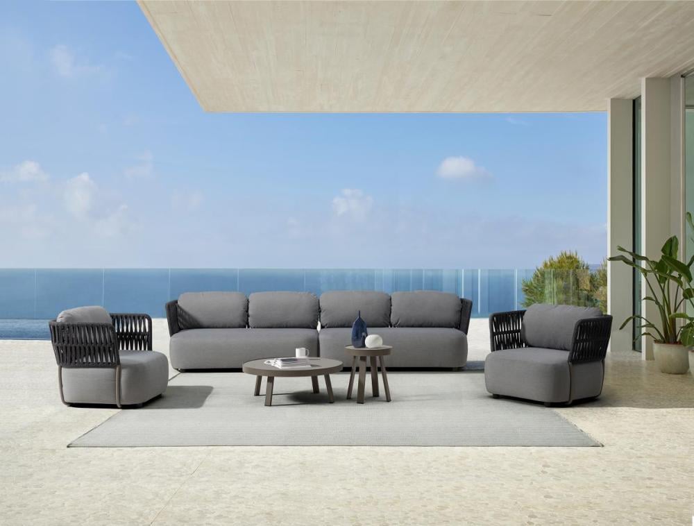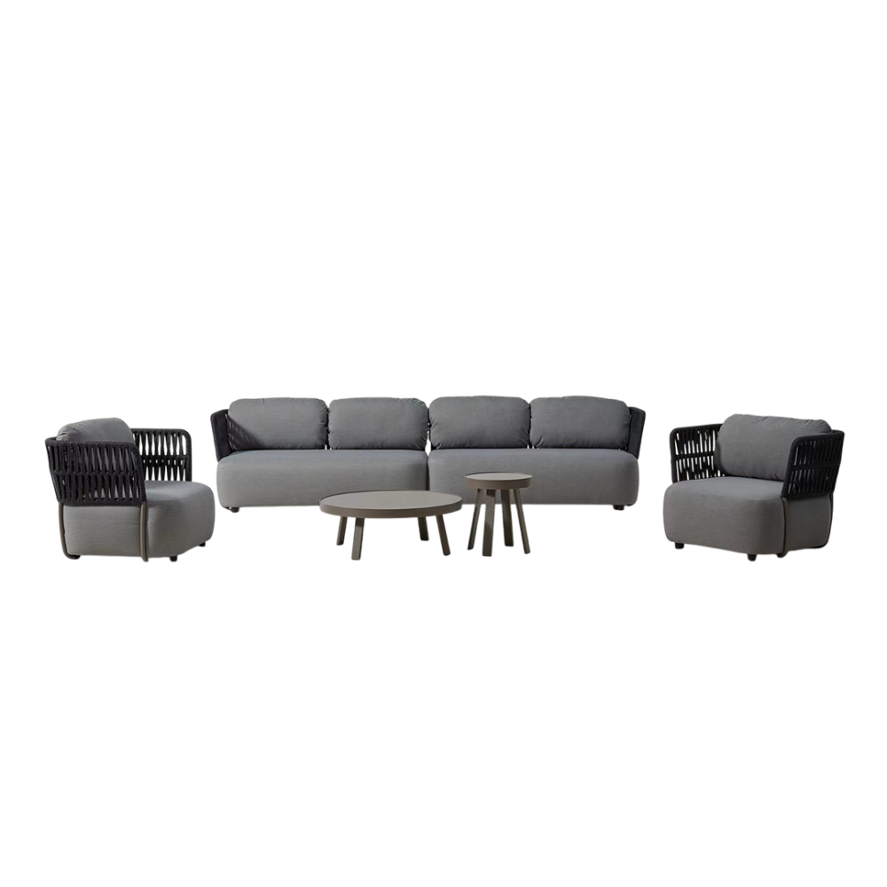 Experience refined outdoor living with the SOFT Outdoor Sofa Set from Loft — a perfect blend of structure, softness, and style. Crafted with Axroma St. Tropez fabric, dark grey rope, and a sleek grey aluminum coffee table, this 5-piece set delivers elegance and durability for spacious patios.