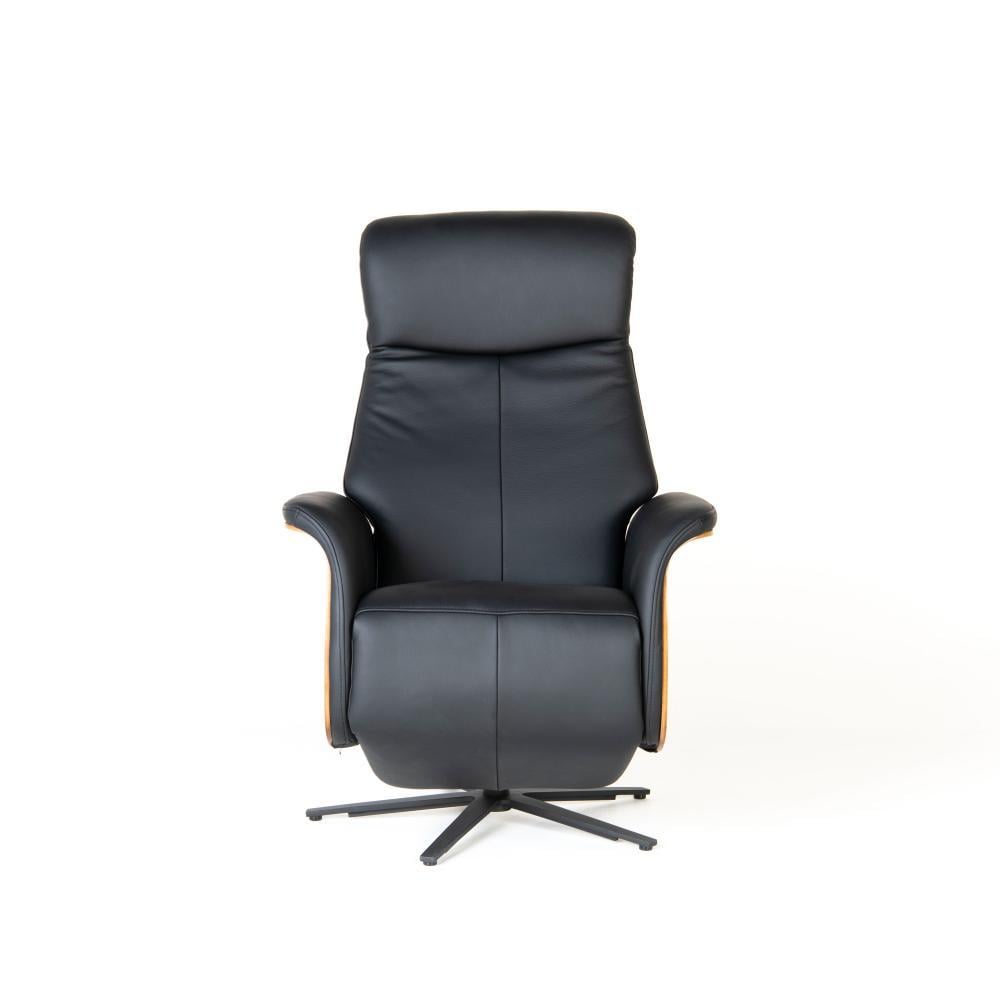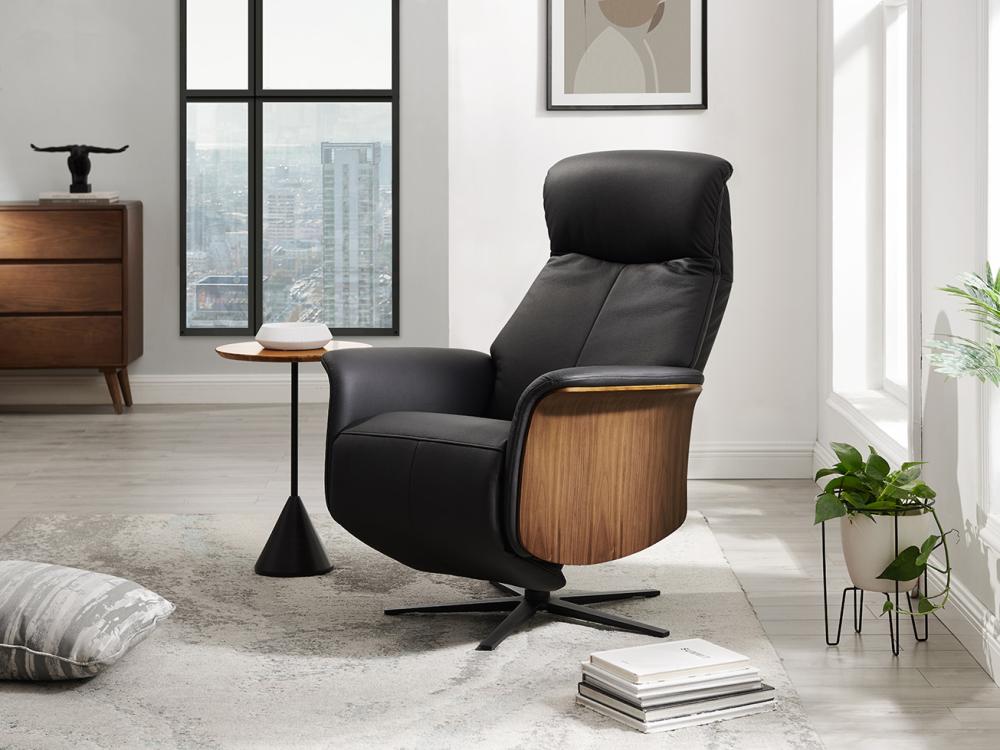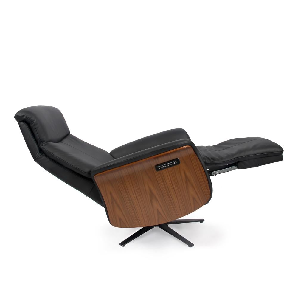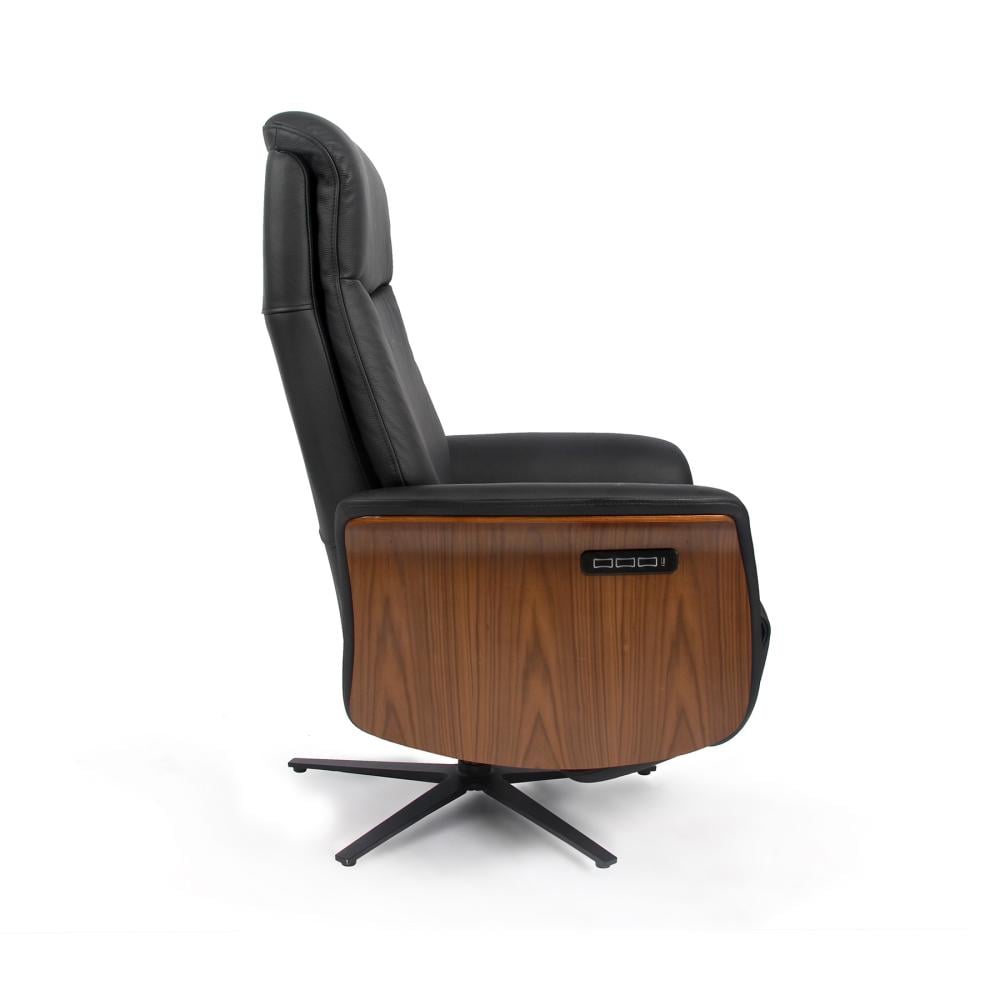 Contrast is a key feature of this comfortable chair, prominently showcased by its striking wooden side panels that enhance any color. The three-motor recliner includes an electrically adjustable backrest and footrest, along with a manually adjustable headrest and a heart balance feature that embraces all parts of the body for optimal comfort. This position can be controlled with a built-in electric lift mechanism, replacing the usual third motor function and curve balance feature with a lift function, providing additional comfort for users. This modern chair fits perfectly next to a coffee table or in your relaxation space.