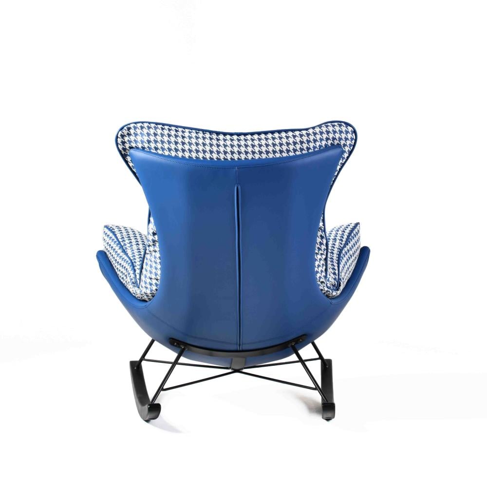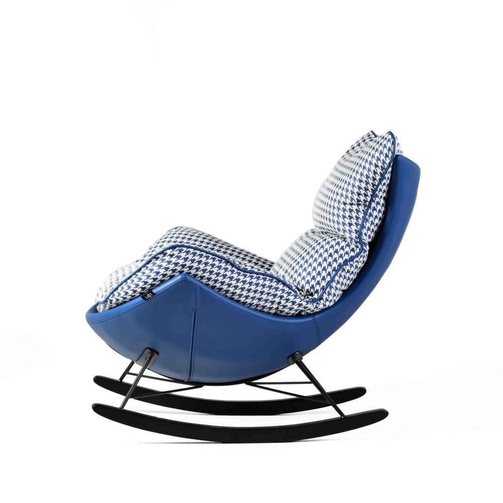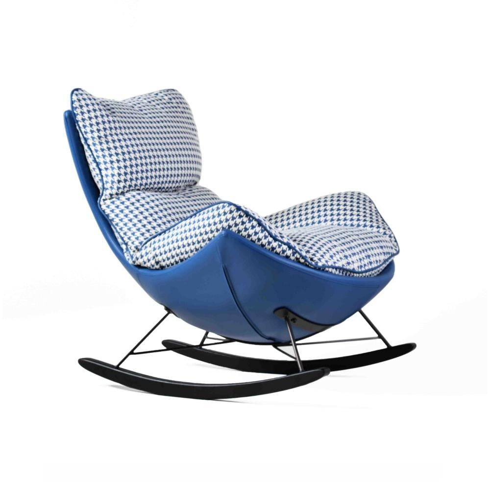 The Remo rocking chair serves as the perfect relaxation chair, allowing you to enjoy the rocking motion that helps relieve daily stress. This comfortable chair is the ideal addition to your relaxation sofa set in the living room. It features a blue and white patterned fabric that coordinates perfectly with modern sofas and coffee table. The sturdy metal base ensures its quality and durability over the long term.