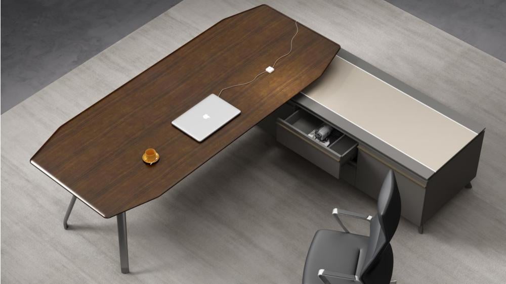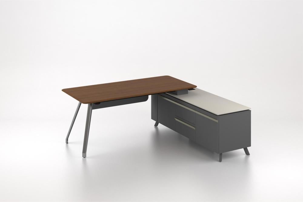 1. Shape: L shaped executive table with rectangular tabletop and fixed side storage