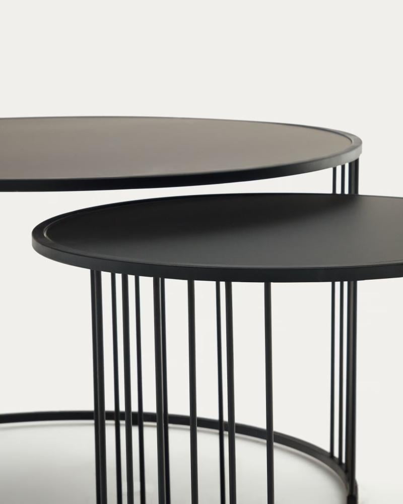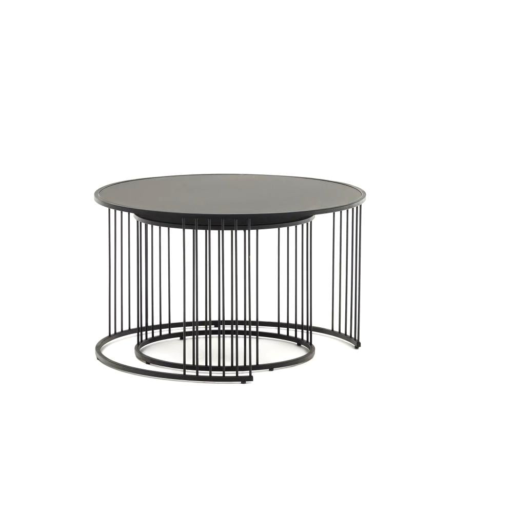 The double coffee table set features two sizes and a unique design that allows the smaller table to be stored underneath the larger one, enabling you to coordinate them as an elegant home decor, whether with a sofa set or accent chairs. These tables come in a matte black color, making them a practical and luxurious choice that complements various side lamps. Made from metal and glass, they add a modern touch to any space in your home.