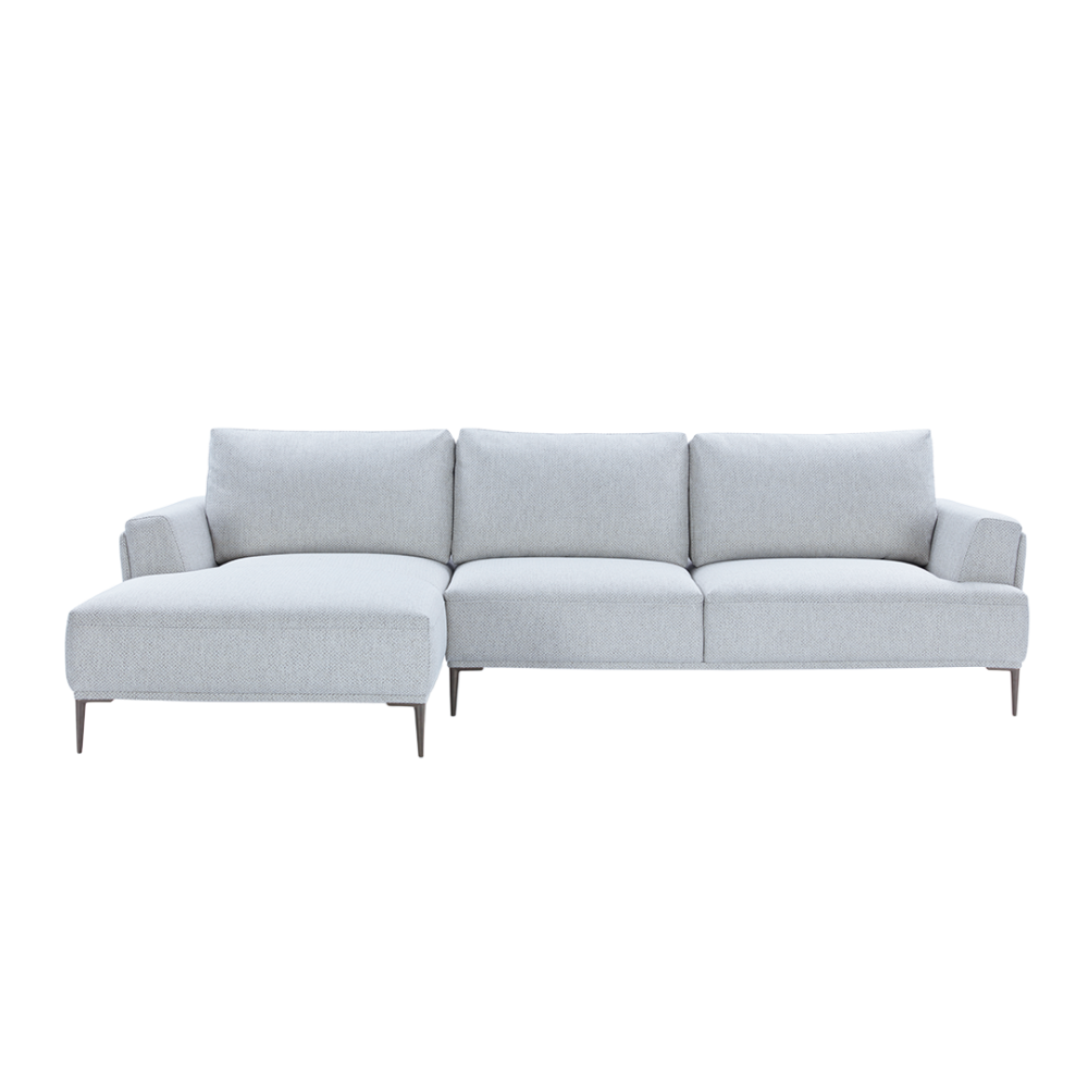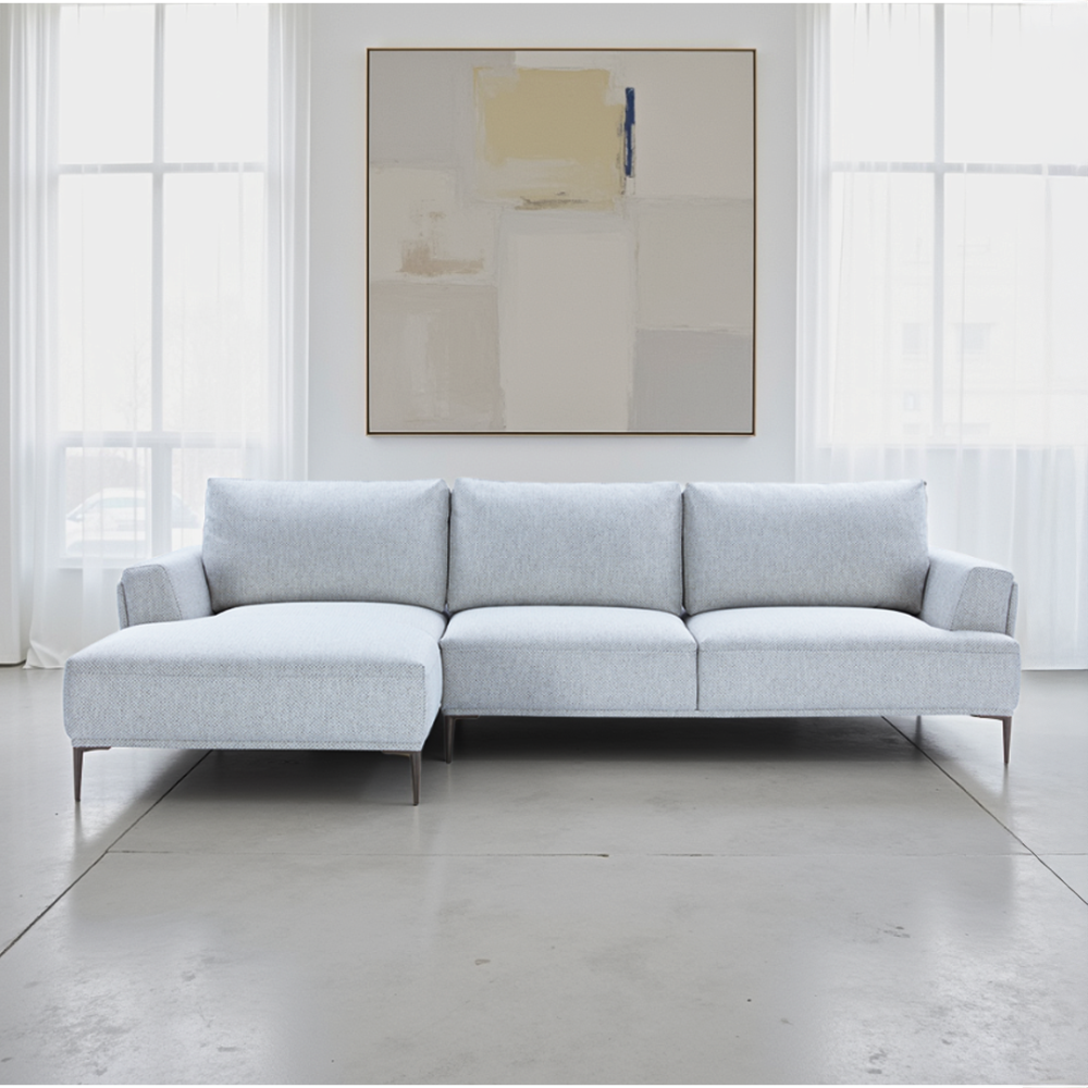 Elevate your home decor with the seamless blend of comfort and style, this L Shape sofa sits three comfortably and also features a chaise lounge on the right. Crafted in a pleasing light grey fabric, it stands sturdy on titanium legs, blending perfectly into any contemporary home setting. Place it in your living room, office, or lounge and set the tone for an elegant and modern space.