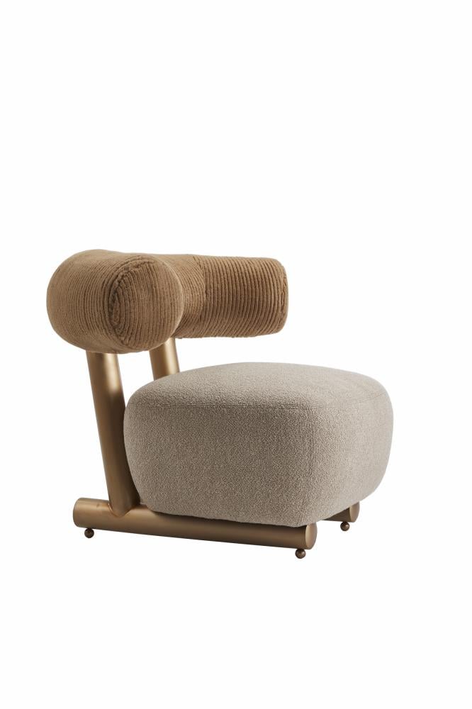 The Leisure chair, with its unique and distinctive design, represents an ideal artistic piece that serves as an attractive addition alongside modern chairs within your home decor. The backrest functions as both a back support and an armrest, thanks to the curved tubular design that provides a semi round chair design. This comfortable chair features a semi-square seat that complements the curvature of the backrest. The relaxation chair combines bronzeand beige colors with a metallic touch in a bronze finish. Its sturdy metal base ensures stability on both carpet and sofa set.
