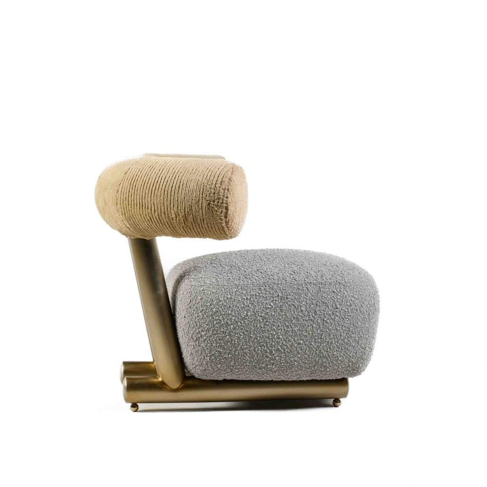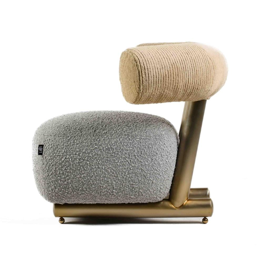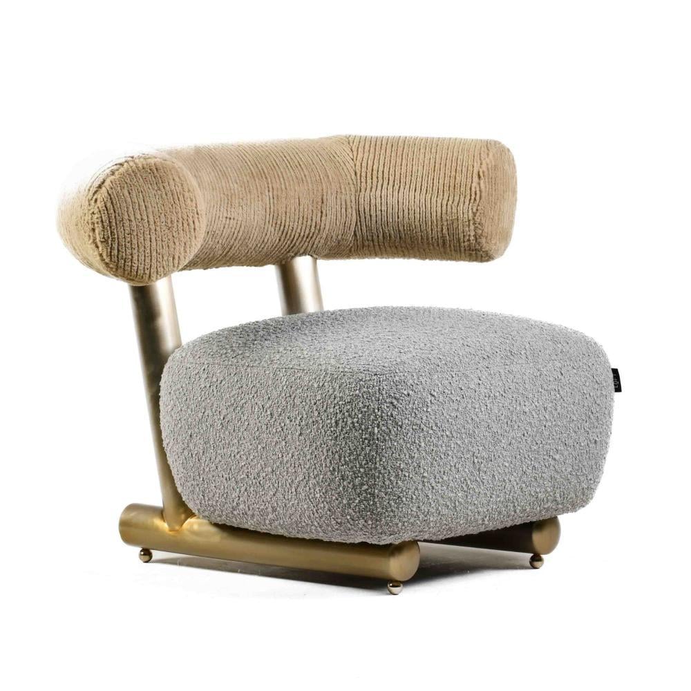 The Leisure chair, with its unique and distinctive design, represents an ideal artistic piece that serves as an attractive addition alongside modern chairs within your home decor. The backrest functions as both a back support and an armrest, thanks to the curved tubular design that provides a semi round chair design. This comfortable chair features a semi-square seat that complements the curvature of the backrest. The relaxation chair combines grey and beige colors with a metallic touch in a bronze finish. Its sturdy metal base ensures stability on both carpet and sofa set.