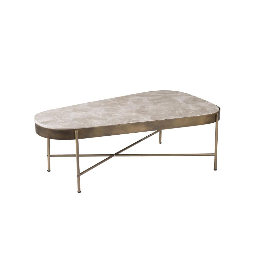This coffee table features a metal frame and a surface made of limestone, known for its exceptional durability. The oval design and surface resembling marble waves allow for easy coordination within your sofa set or with accent chairs. The table's base is made of metal coated in rose gold, making it a practical yet luxurious choice that complements various side lamps. It adds a touch of elegance to the sectional sofas.